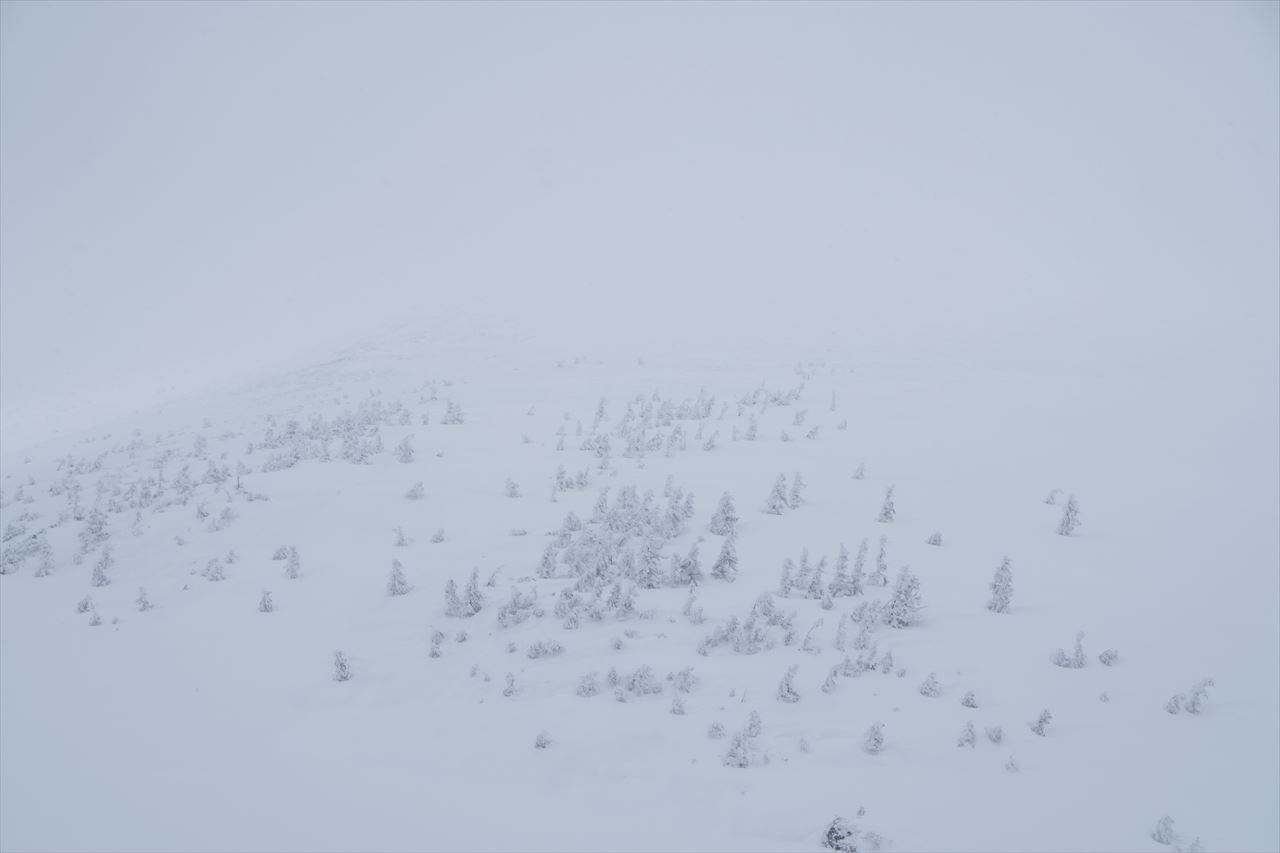 酸ヶ湯温泉駐車場から見える八甲田大岳は、山頂が見えていい具合のように思えたのですが、八甲田清水を経由しラッセルしながら山頂直下まで行くと、風が出て降雪が始まり山頂はあっという間に見えなくなりました。
