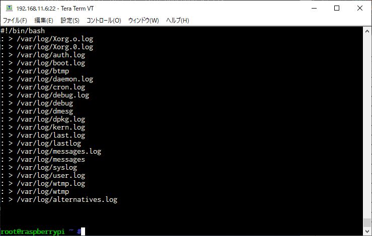 これで、ログディレクトリが結構綺麗になります。あとは、時々/var/logを見てみて、必要に応じて消去あるいはファイルサイズをゼロにする対象ファイルを追記願います。