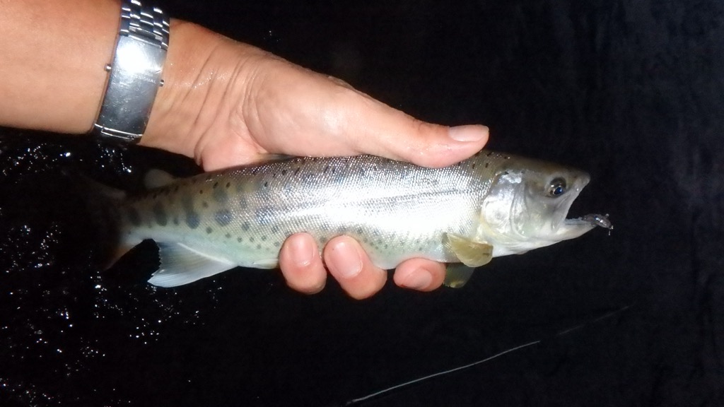 | 8月17日 | 大湯川 | 曇りのち雨 | 未計測 | 東風 | 多い | 少し濁り | ヤマメ5匹/累計187匹 | ウェット | 20センチ越えは写真の1匹のみ。 |