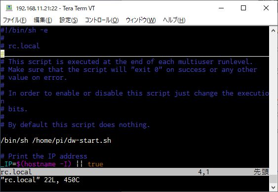 /bin/sh /home/pi/dw-start.shを行頭の#が連続して終わったあたりに記入します。