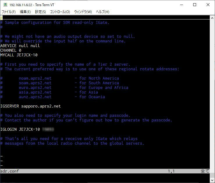 その次に/home/pi/sdr.confにコールサイン、APRSサーバーログインコードを書きます。